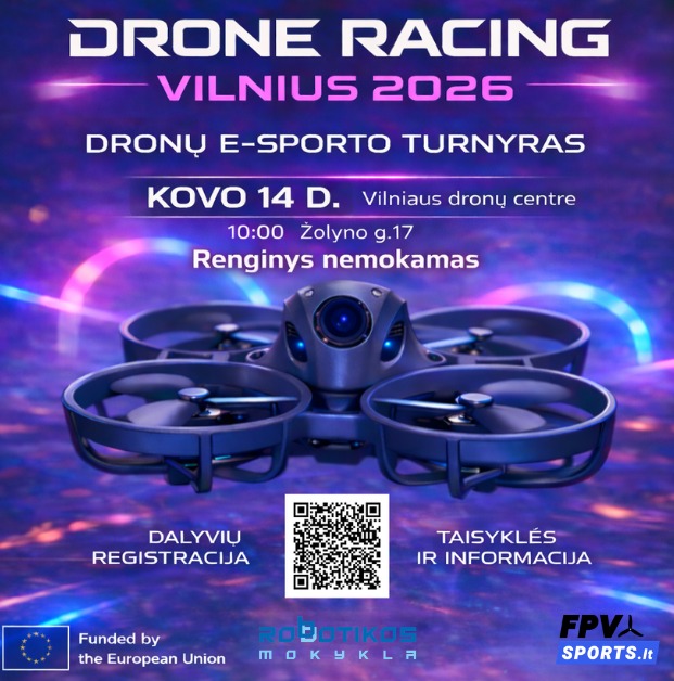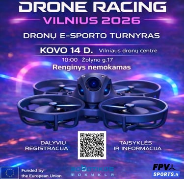 Jau šį šeštadienį, kovo 14 d., Vilniaus Dronų Centras taps vieta, kur svajonė skristi bei pilotuoti droną tampa realybe. Čia pirmą kartą organizuojamas Dronų ir E-Sports turnyras – renginys, kviečiantis visus, net neturinčius jokios patirties, išbandyti FPV dronų lenktynes, virtualią realybę bei skrydžio simuliatorius.
